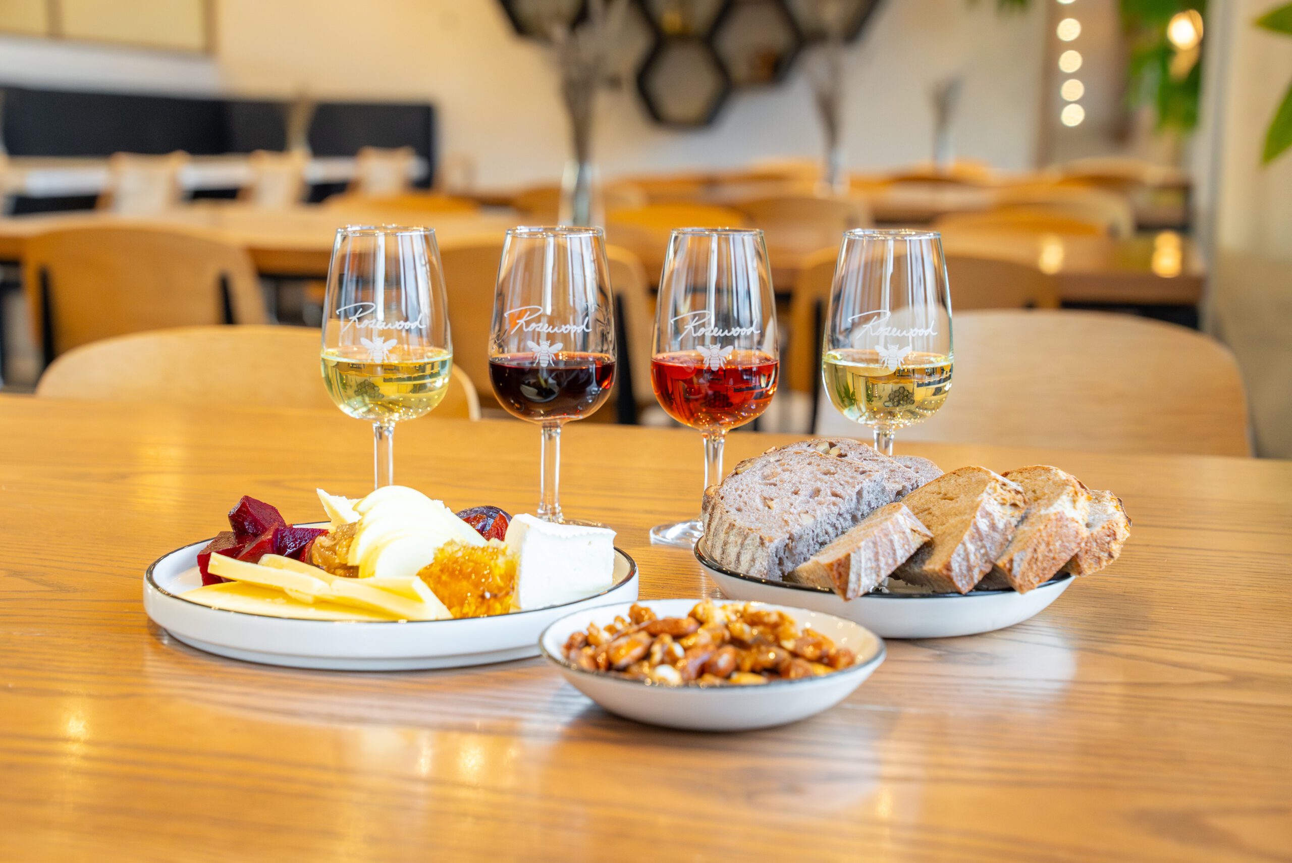 Settle in for a tasting flight that brings together a mix of meads and wines, offering a clear sense of Rosewood’s beekeeping roots and winemaking approach. Thoughtful snack pairings round out the experience, from seasonal dips served with vegetables and flax crackers to an Ontario cheese board layered with honeycomb, honey nuts, fruit, lavender honey compote and fresh house-made sourdough.