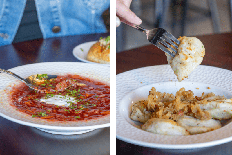 Warming up with a fresh bowl of soup is a must. You can go classic with their borscht, a beet based soup which is bright and earthy or try the Transcarpathian bograch. This rustic soup is loaded with chopped veggies and spiced sausage for a heartier slow cooked bite.