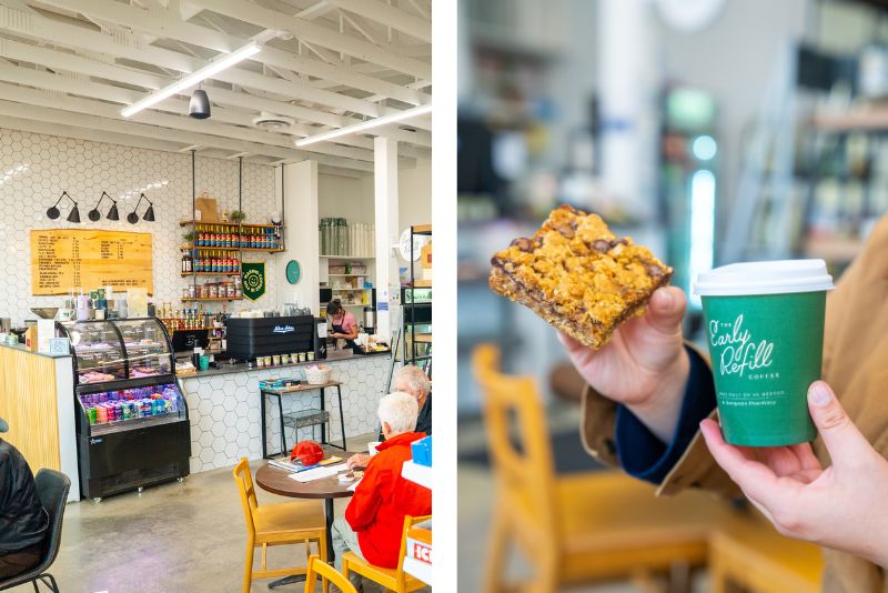 After exploring, stop in at The Early Refill Café just down the road. It’s small, welcoming and always smells like something delicious. Sip a spiced apple cider and grab a gooey caramel oat square before heading back to town. It’s a sweet reward that feels just right after time on the trails.