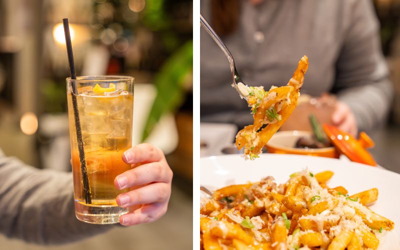 We opted to settle in with a drink and a few small bites like warm marinated olives served with roasted garlic, orange and feta and their crowd favourite truffle fries topped with parmesan and scallions.