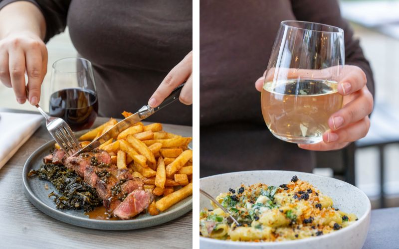 Their menu highlights thoughtful, seasonal plates. During our visit we enjoyed the Flat Iron Steak Frites served with braised kale, herb mayo, crisp fries and a peppercorn cream jus. It pairs beautifully with their Cabernet Franc, which brings just the right amount of richness to the dish.