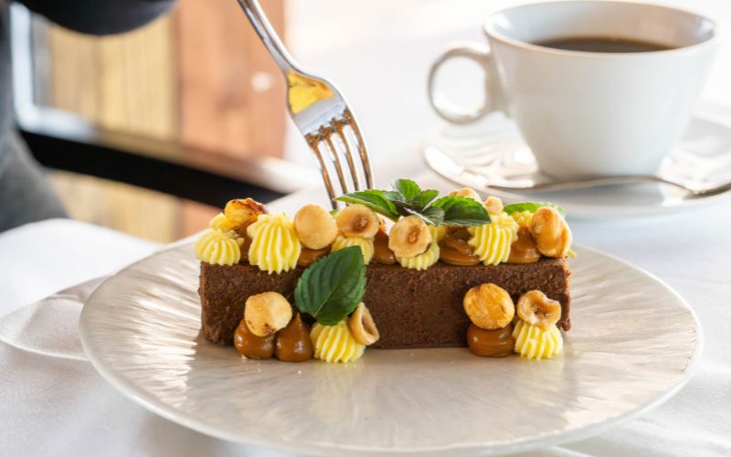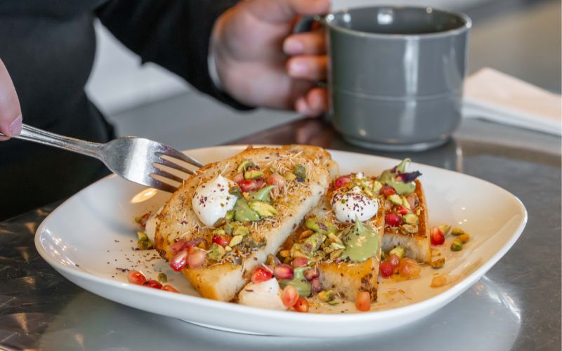 During our visit we tried the Pistachio Cream French Toast, a beautiful plate layered with rose scented ricotta, saffron and cardamom syrup, pistachio cream, rose petals, pomegranate and crisp kataifi. For something savoury, the Pork Belly Benedict Tartine delivered rich, comforting flavours with seared pork belly, poached eggs, lemon and chive Hollandaise, pickled onion and herb and garlic crushed potatoes.